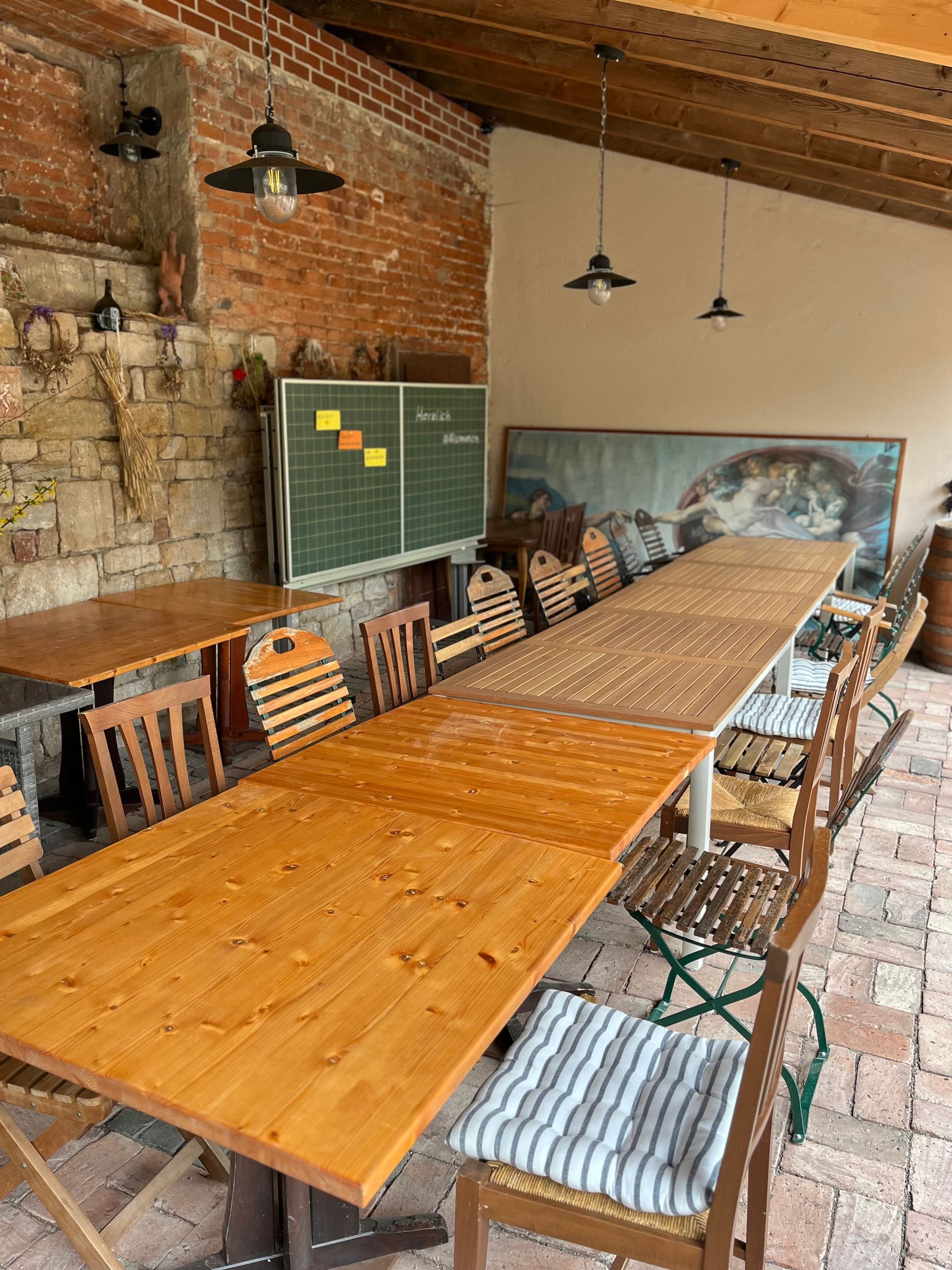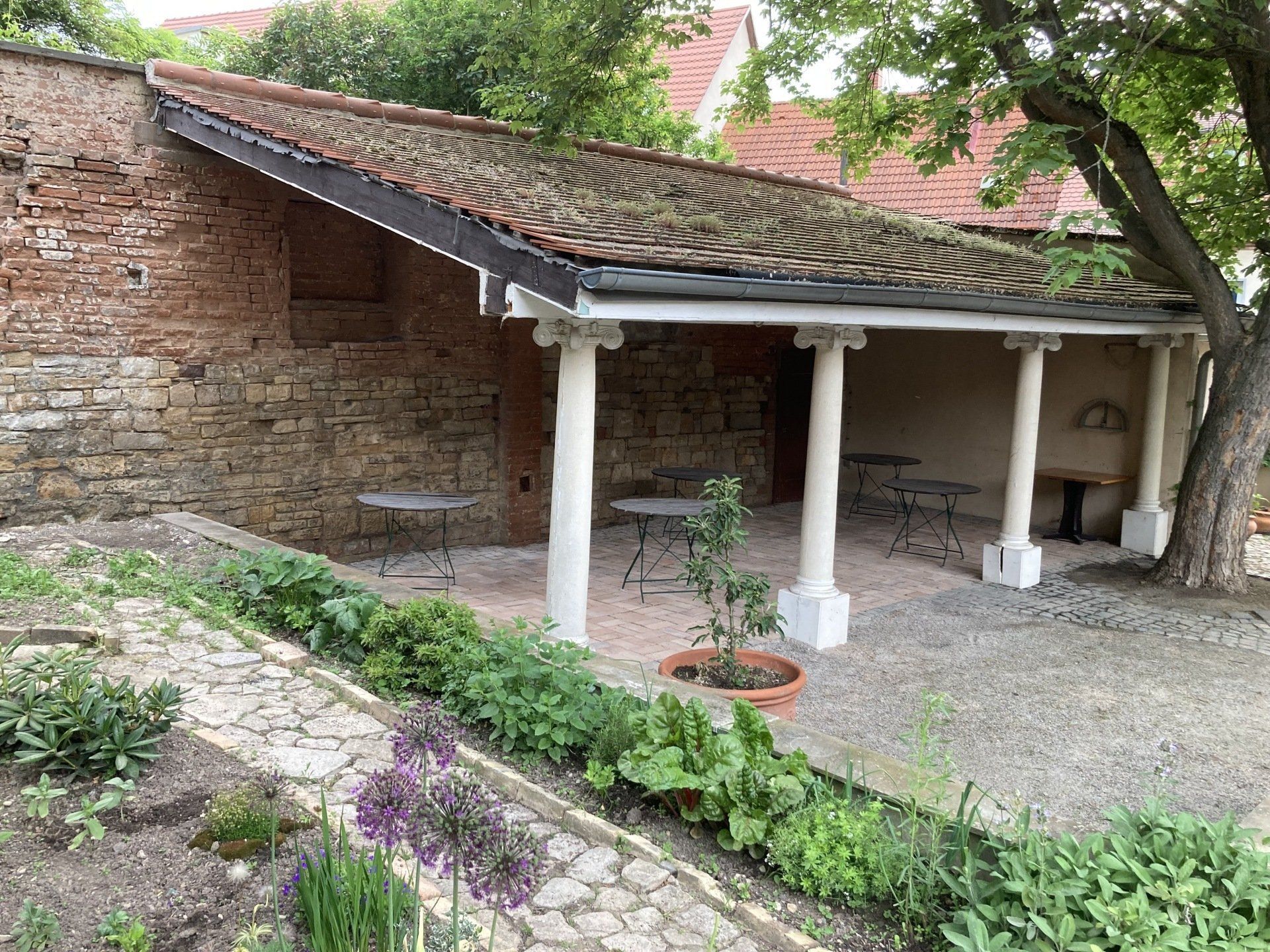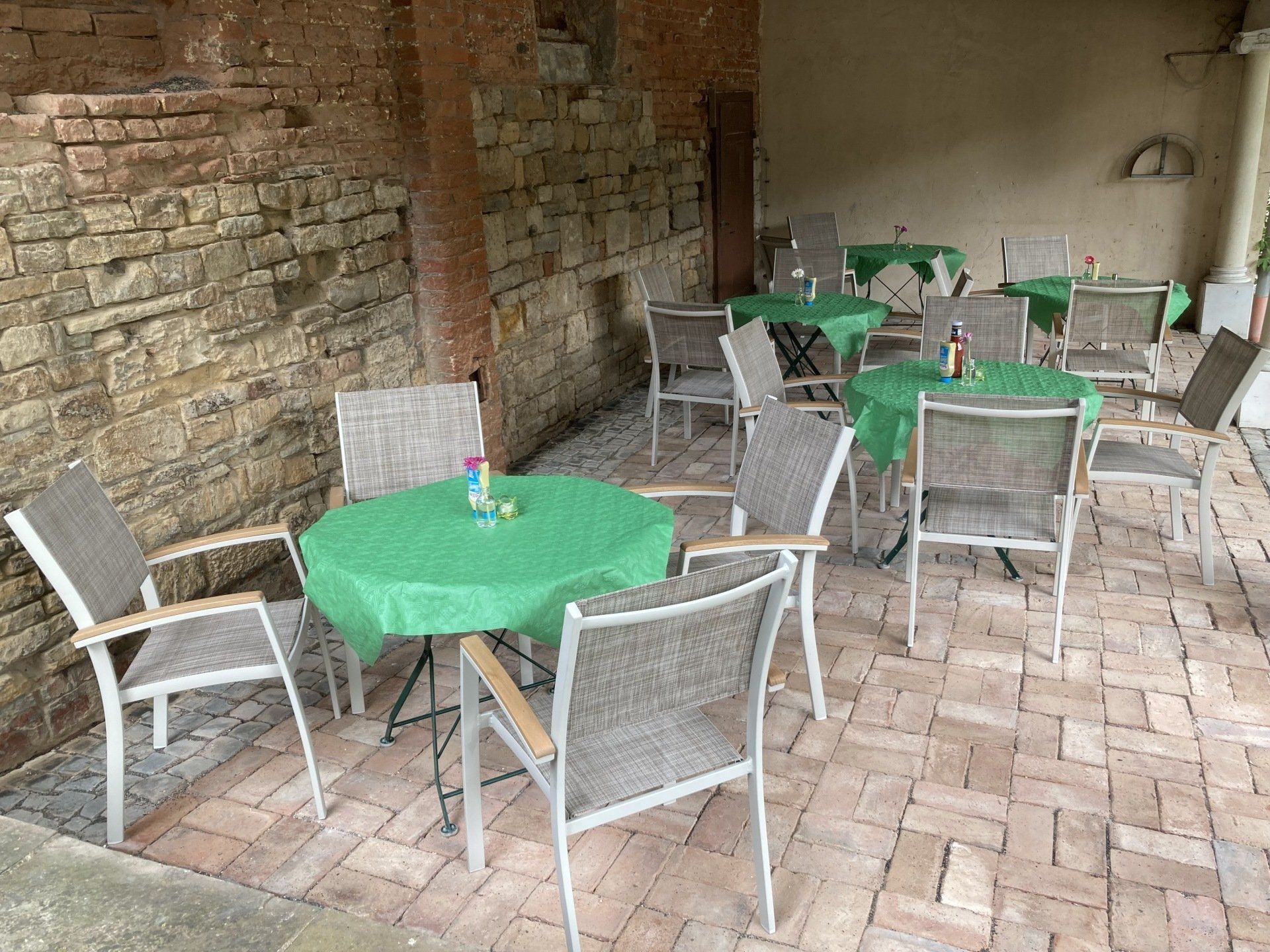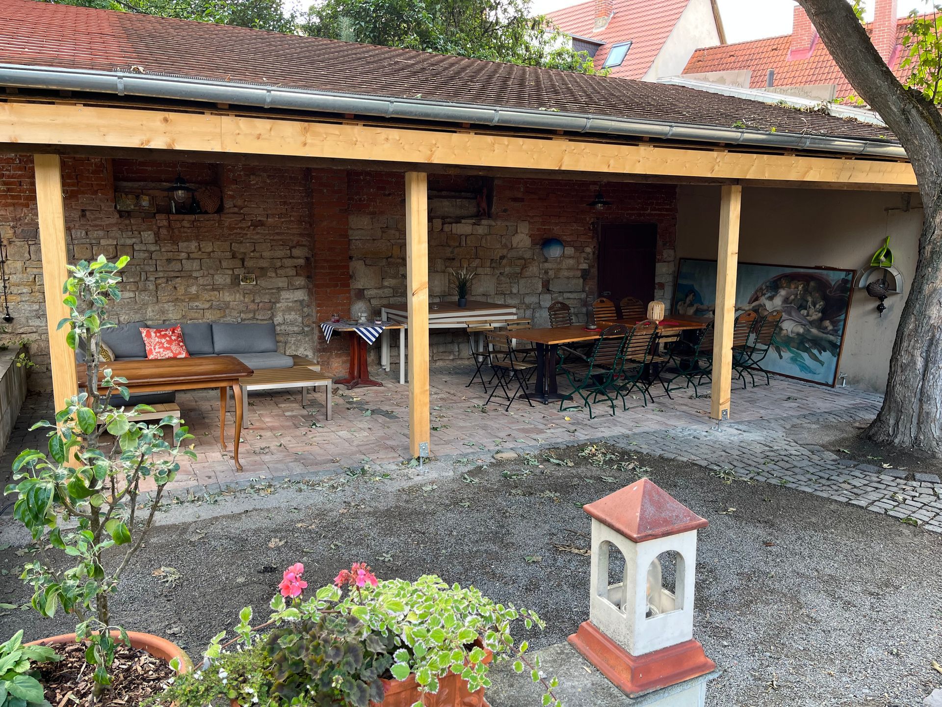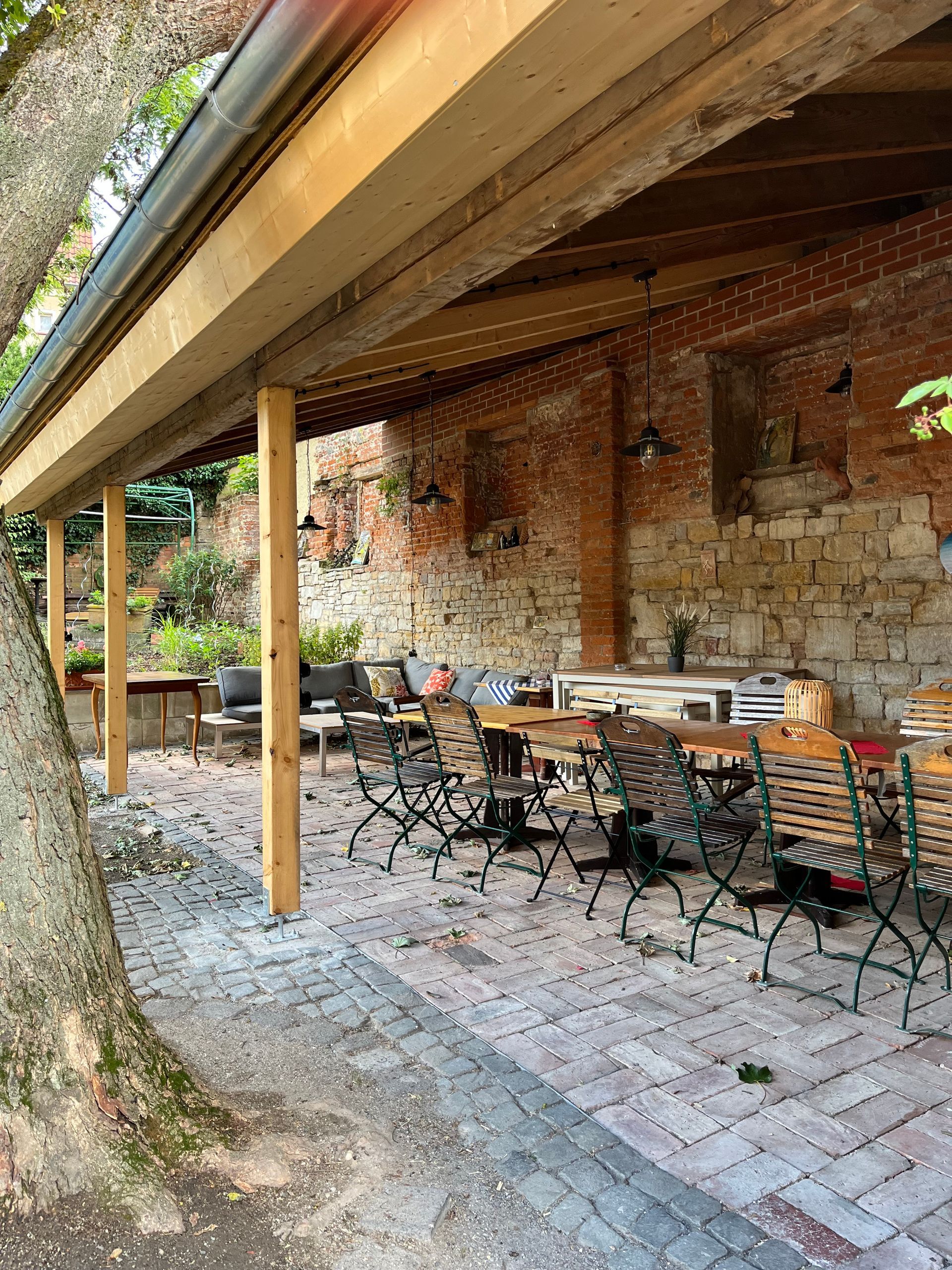 Unser Unterstand erstrahlt in neuem Licht und ist dicht. Sie können nun bei Wind und Wetter trocken sitzen und das direkt an einer alten Stadtmauer. Im Frühjahr haben wir die Fassade zum Innenhof erneuert und einige Holzarbeiten an Türen und Fenstern vollzogen.
