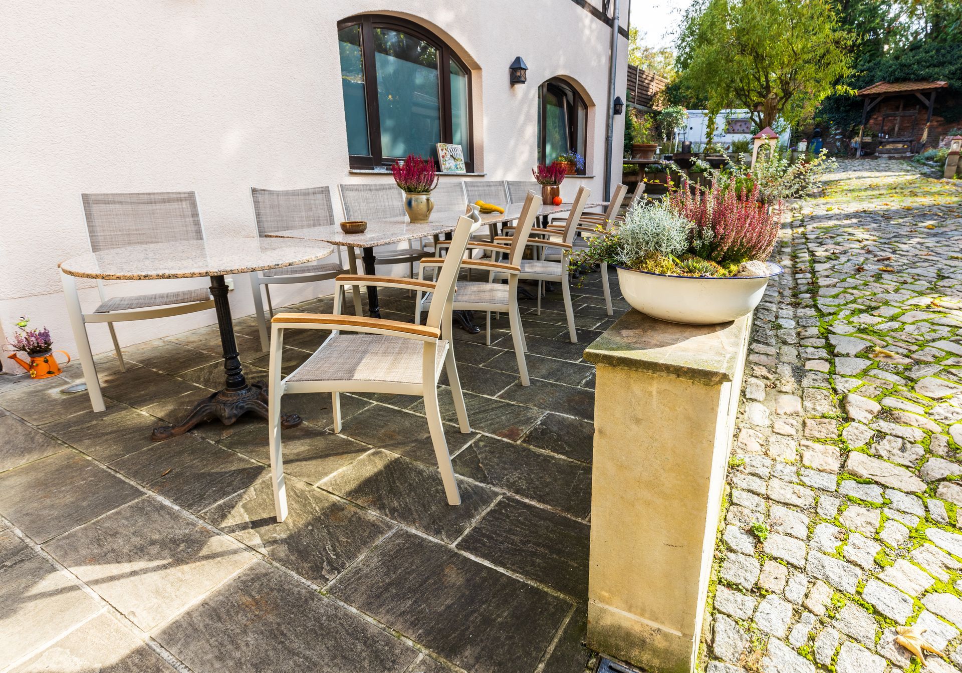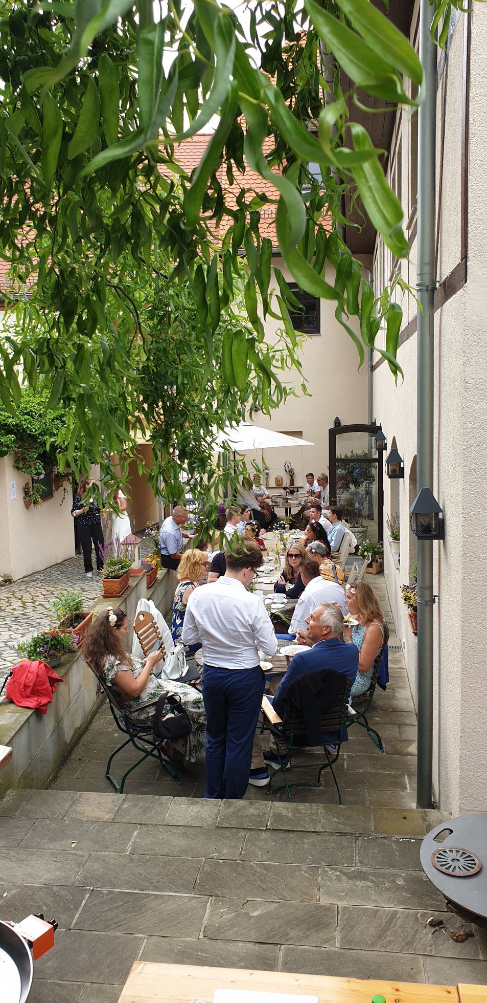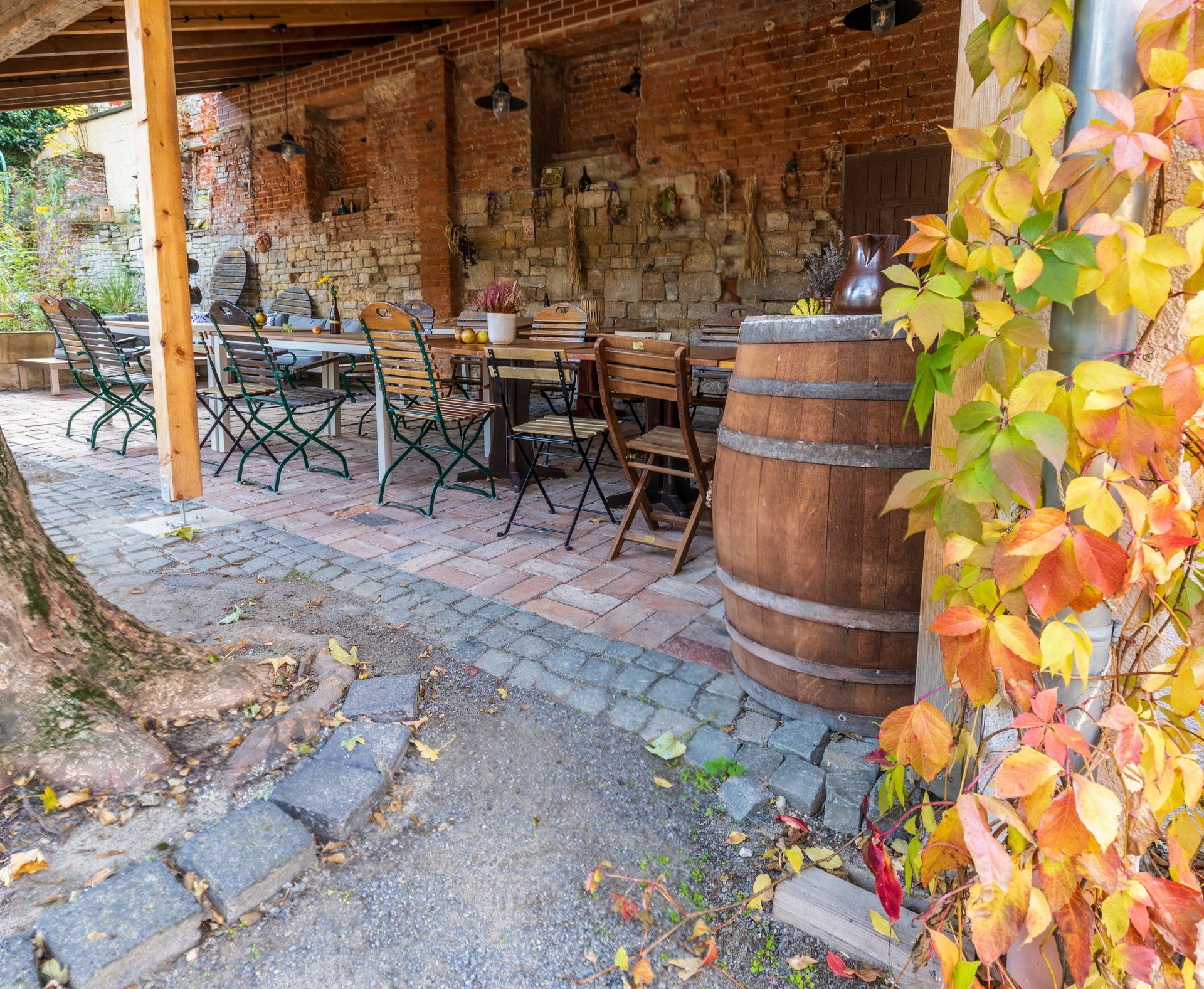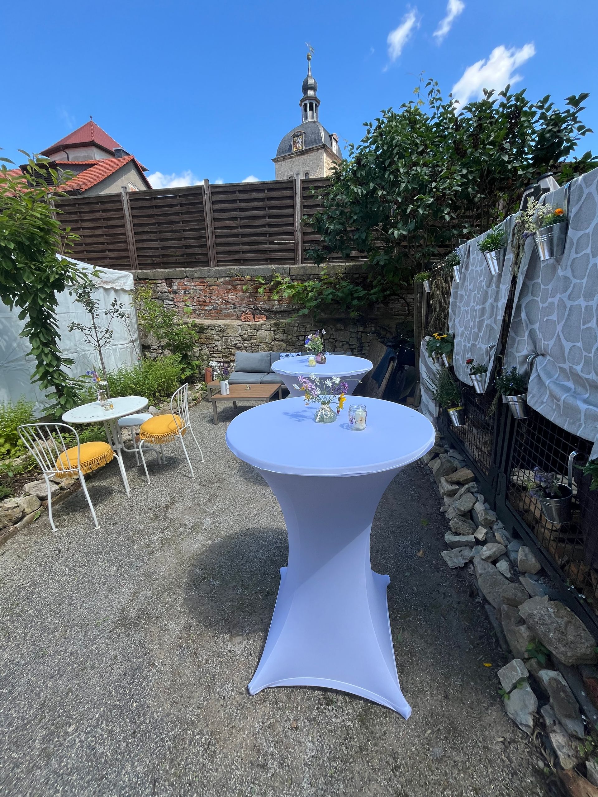 Unser Unterstand erstrahlt in neuem Licht und ist dicht. Sie können nun bei Wind und Wetter trocken sitzen und das direkt an einer alten Stadtmauer. Im Frühjahr haben wir die Fassade zum Innenhof erneuert und einige Holzarbeiten an Türen und Fenstern vollzogen.