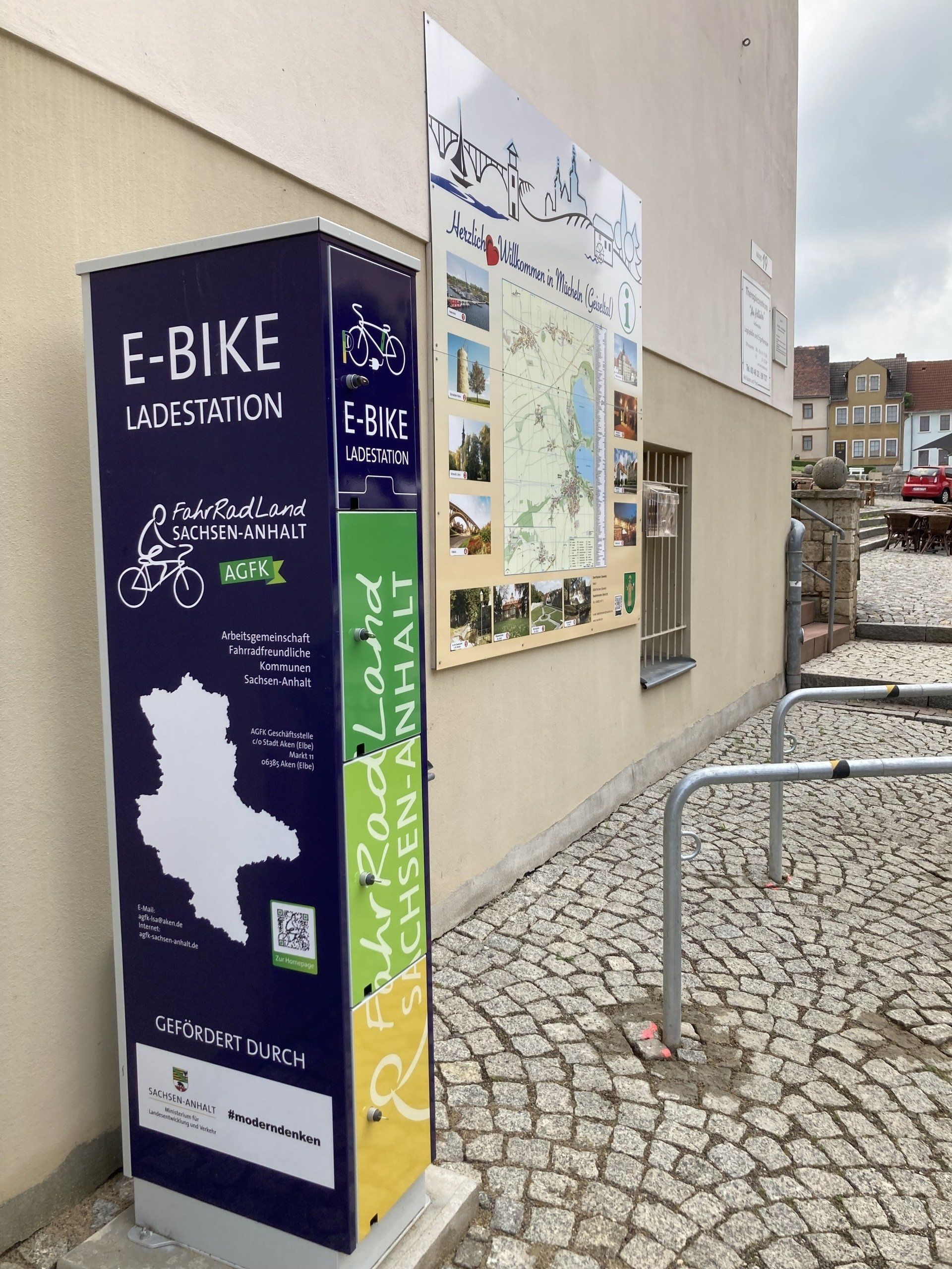 Mücheln hat eine Ladestation für e-bikes, 100 m vom Gästehaus entfernt. An der Marina können Sie auch PKW mit E-Antrieb laden.