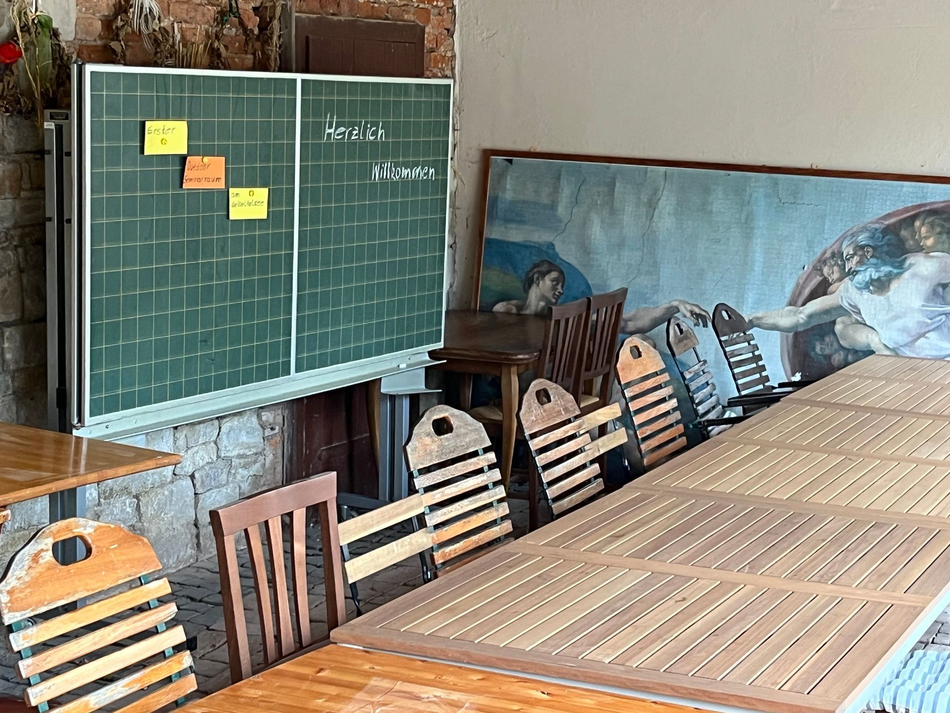 Seit Dezember 2024 haben wir in unserem "Salon" eine Ledercouch-Ecke geschaffen, damit können Sie auch einmal fern des Gastraumes sich zurückziehen und die Ruhe genießen. Für Seminar- und Workshop-Teilnehmer eine weitere Möglichkeit für konzentrierte Arbeit in Kleingruppen.